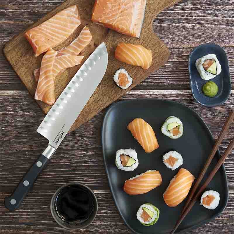 Le célèbre Couteau Santoku Top Chef, avec sa lame polyvalente de 18cm, est redoutablement efficace pour couper, ciseler et émincer à partir d'un mouvement de balancier : alvéolée, elle glisse plus facilement sans adhérer aux aliments !