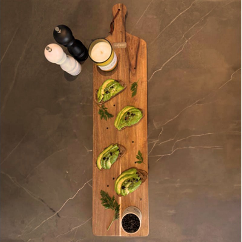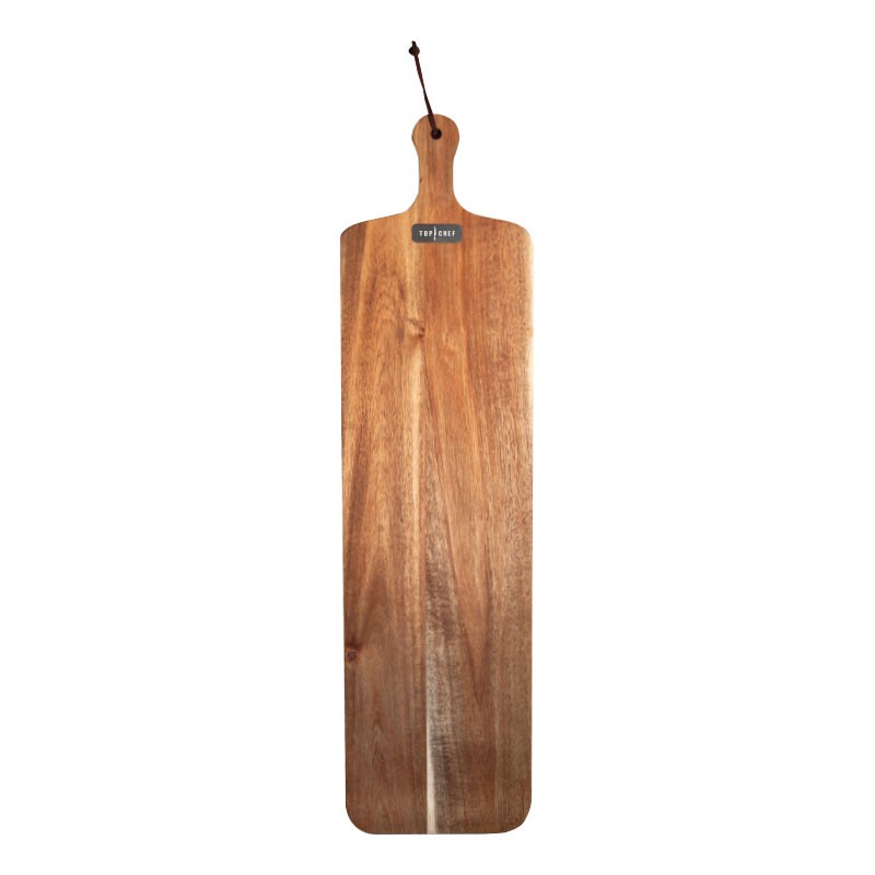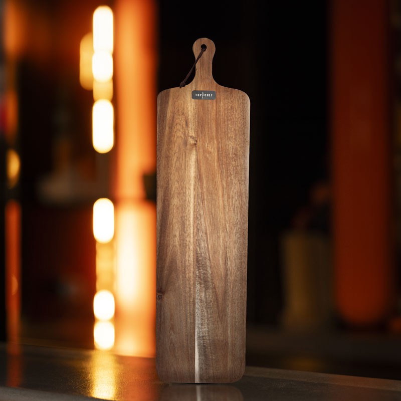 La planche XXL Top Chef est fabriquée en acacia massif, un beau bois réputé pour sa résistance à l'humidité, ce qui assure sa durabilité sur le long terme.