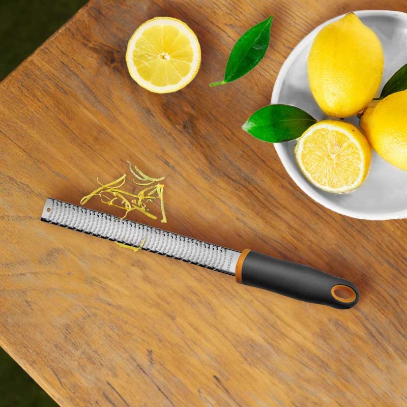 Avec la râpe zesteur Top Chef, parfumez vos plats avec des zestes d'agrumes, ajoutez du fromage sur vos pâtes ou une touche de noix de muscade à vos recettes. La lame tranchante en acier inoxydable de la râpe Top Chef assure des résultats précis et uniformes.