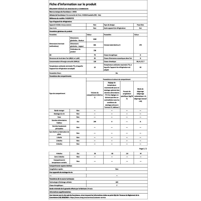 - 270 litres nets dont réfrigérateur 244 litres et congélateur 26 litres