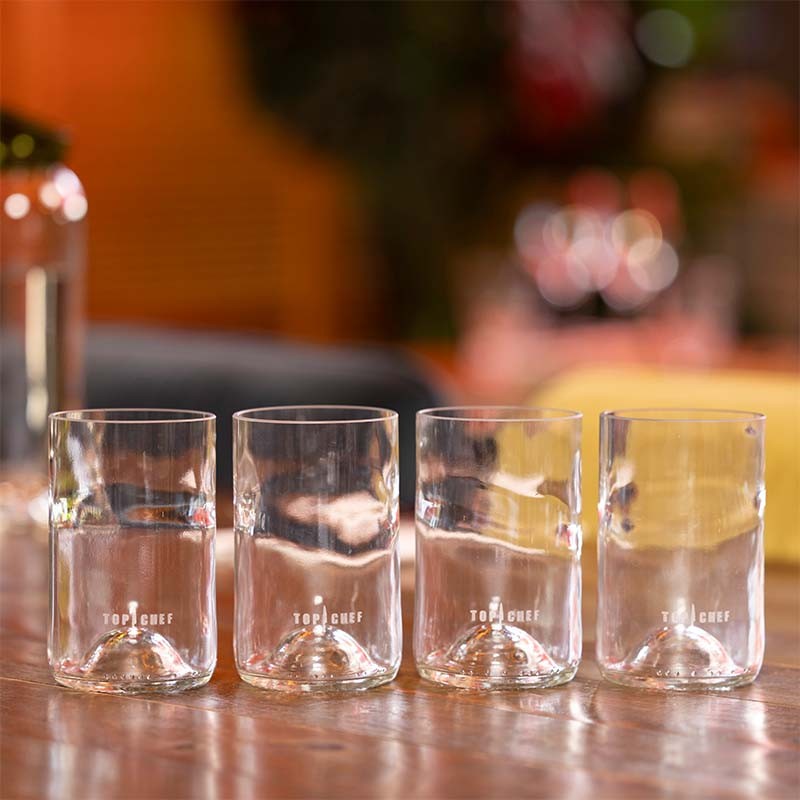 Ce set de 4 verres Top Chef est façonné en France à partir de bouteilles bordelaises : chaque pièce est unique, ce qui peut offrir de subtiles nuances de teintes.